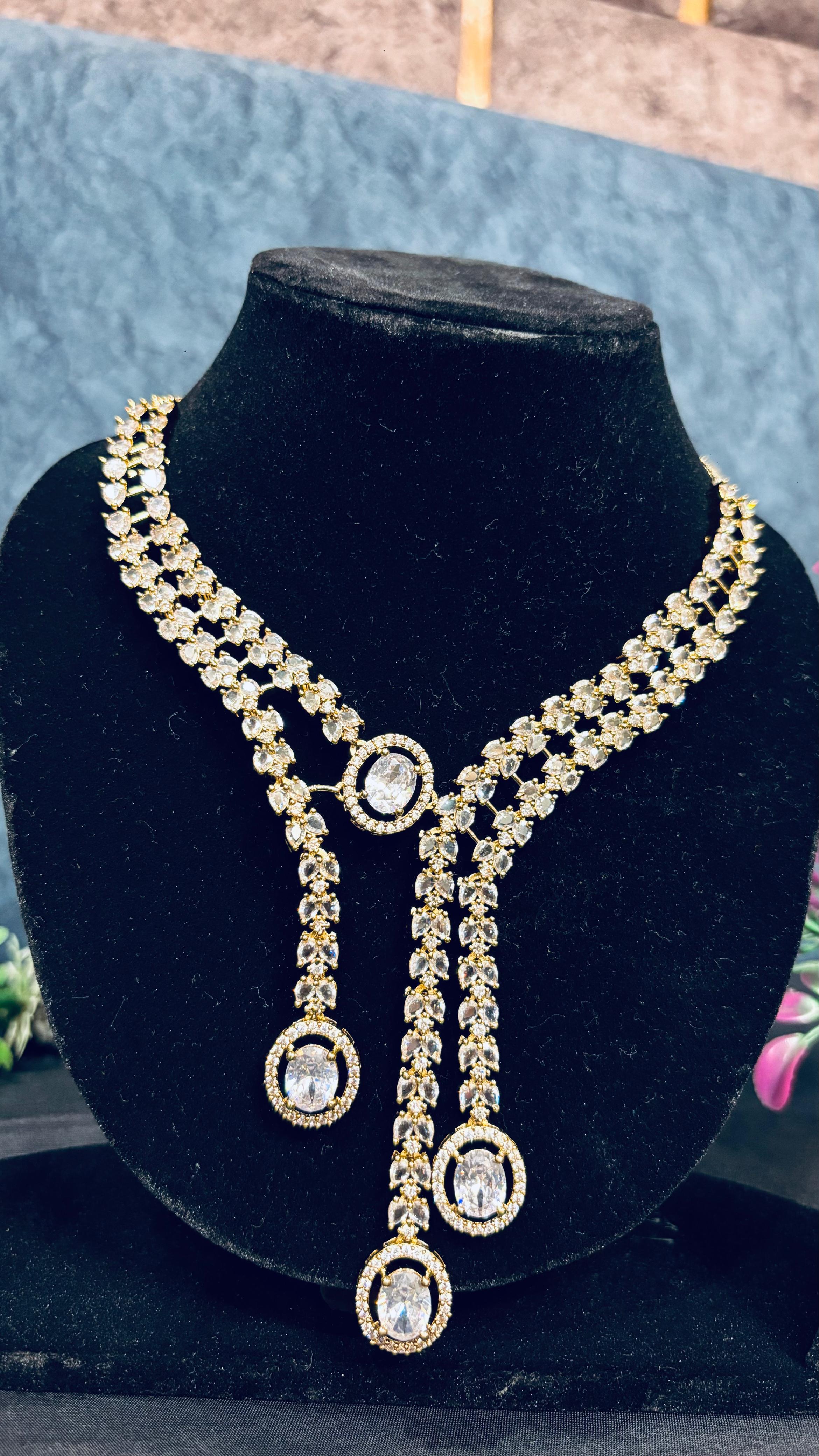 Add a royal glow to your special occasions with this stunningย American Diamond Golden Set, crafted with brilliance and elegance. The set features a dazzling necklace adorned with sparkling American Diamonds, highlighted with a radiant golden finish that enhances its timeless charm. Matching earrings complete the look, making it the perfect choice for weddings, festive celebrations, and grand parties.