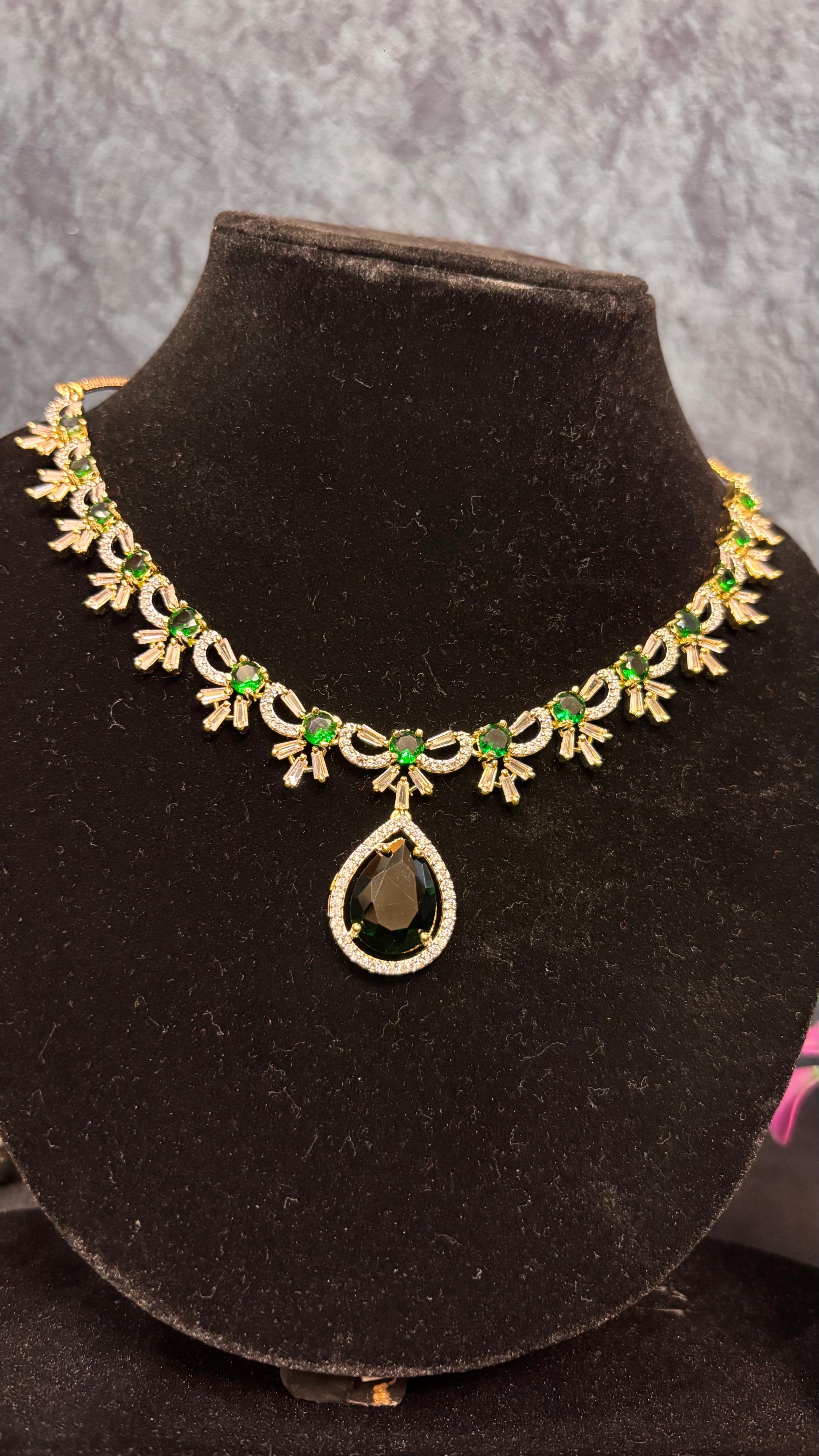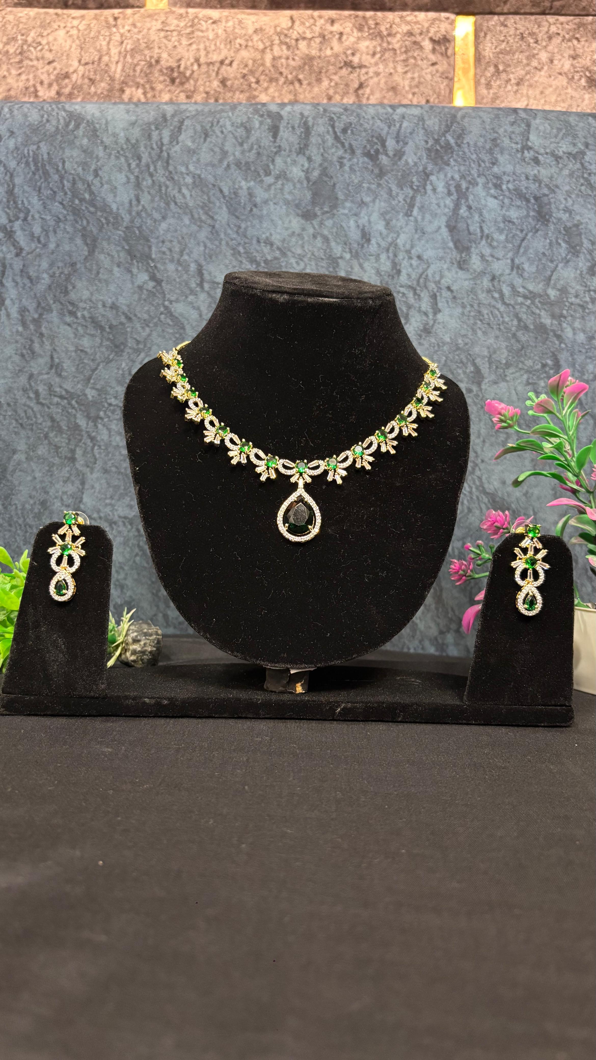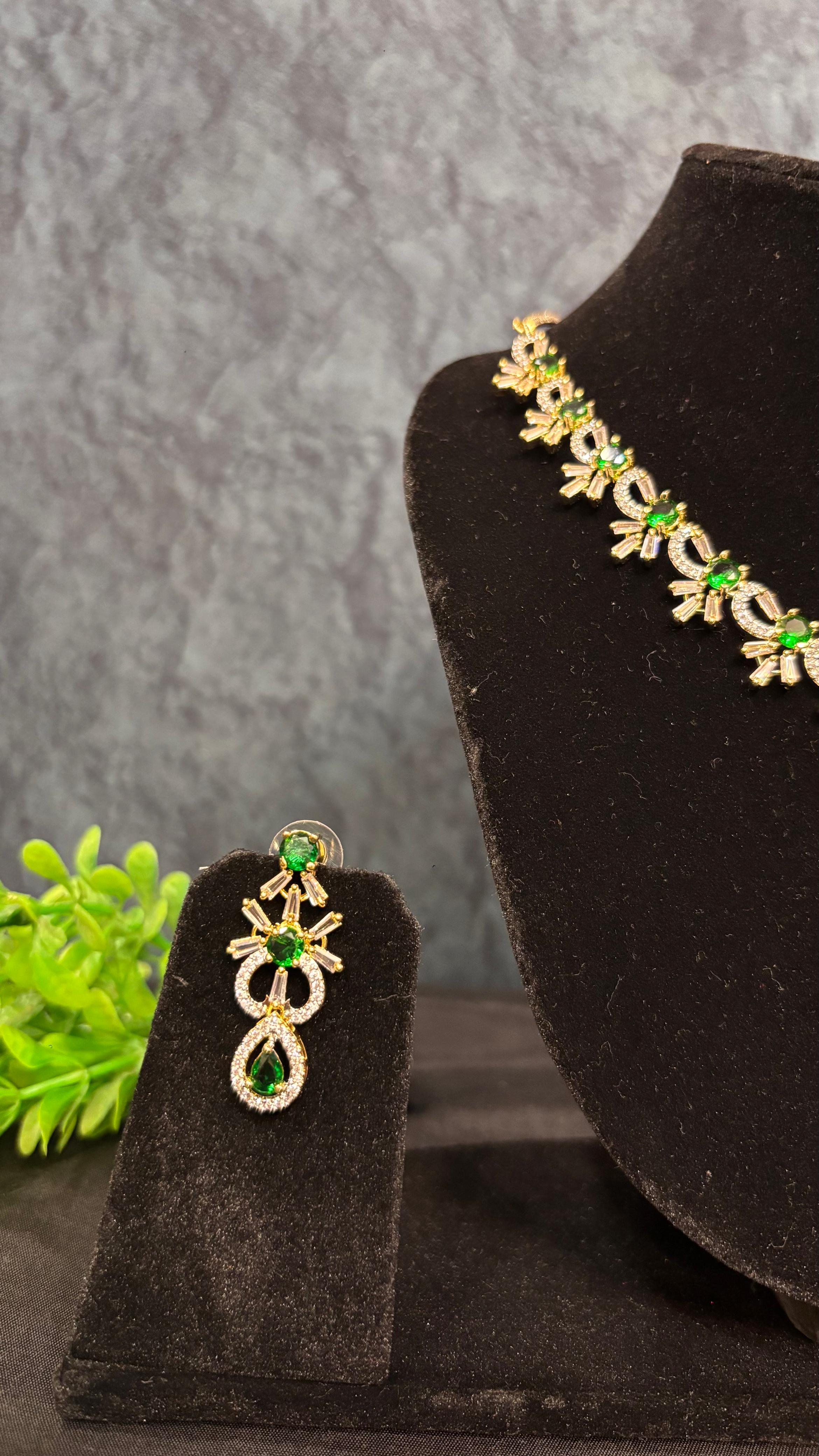 Step into elegance with this breathtakingΒ AD Green Jewellery Set, designed to add a regal charm to your look. The necklace is embellished with sparkling American Diamonds, paired with radiant green stones that bring a touch of freshness and luxury. Matching earrings complete the set, making it perfect for weddings, festive occasions, and evening parties.