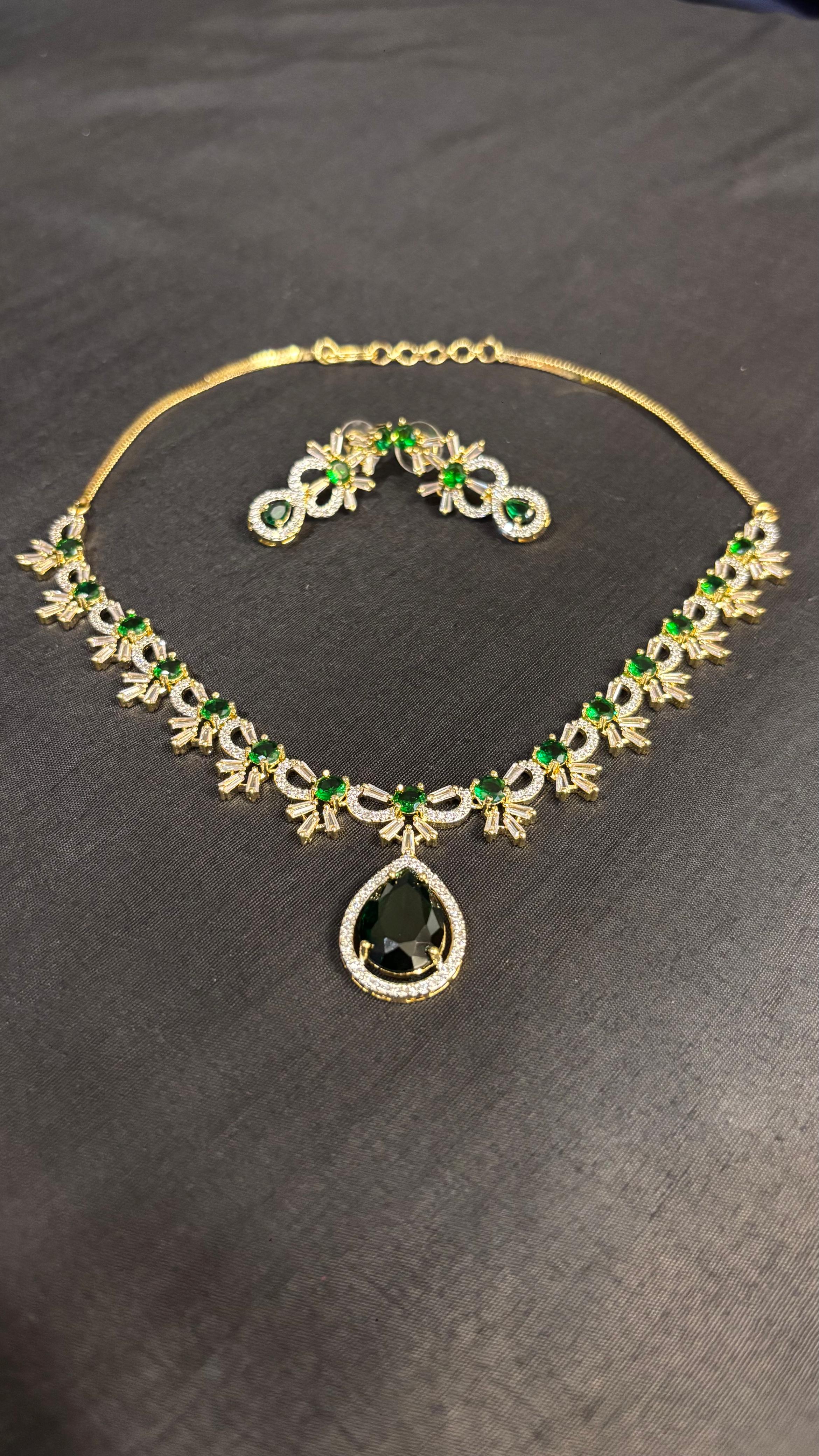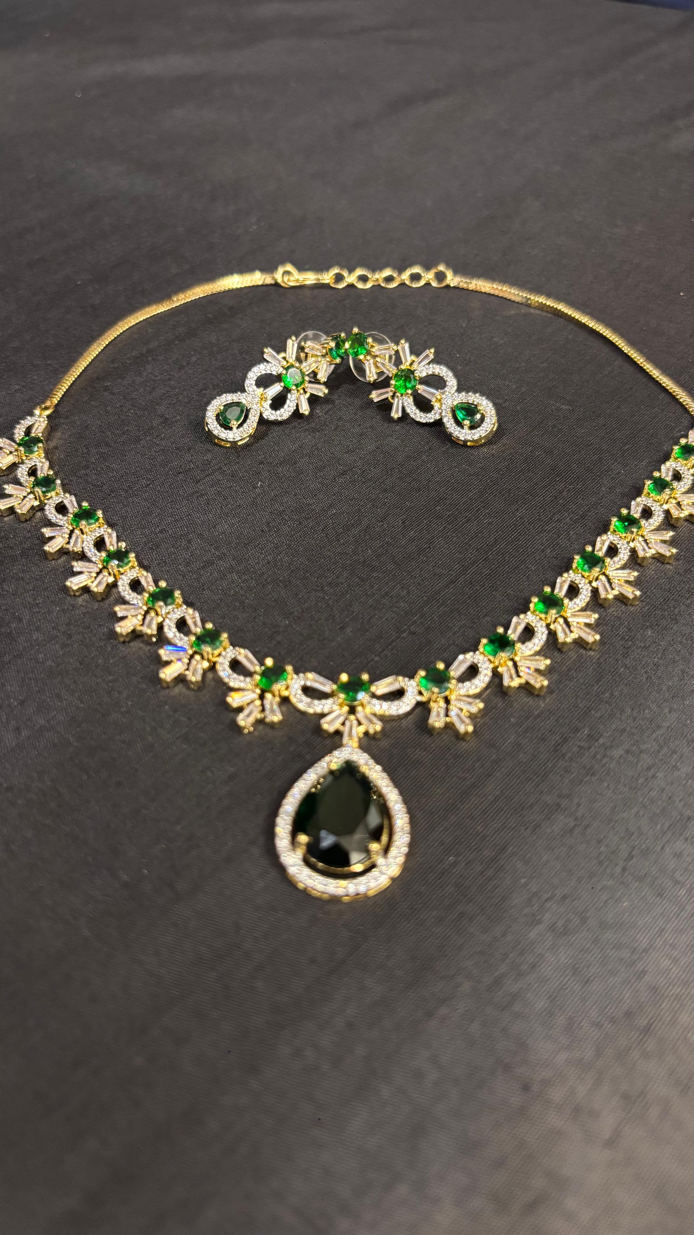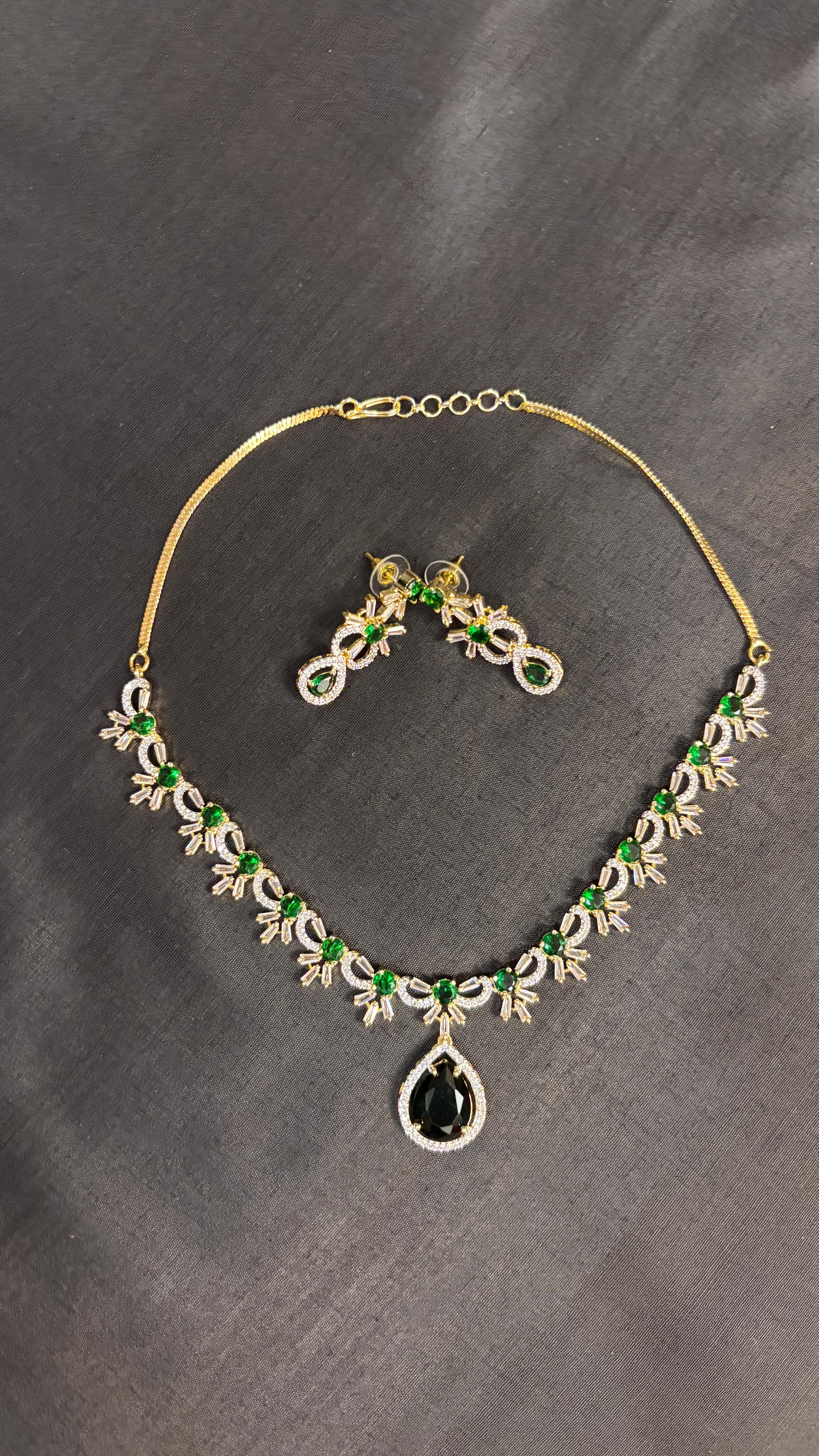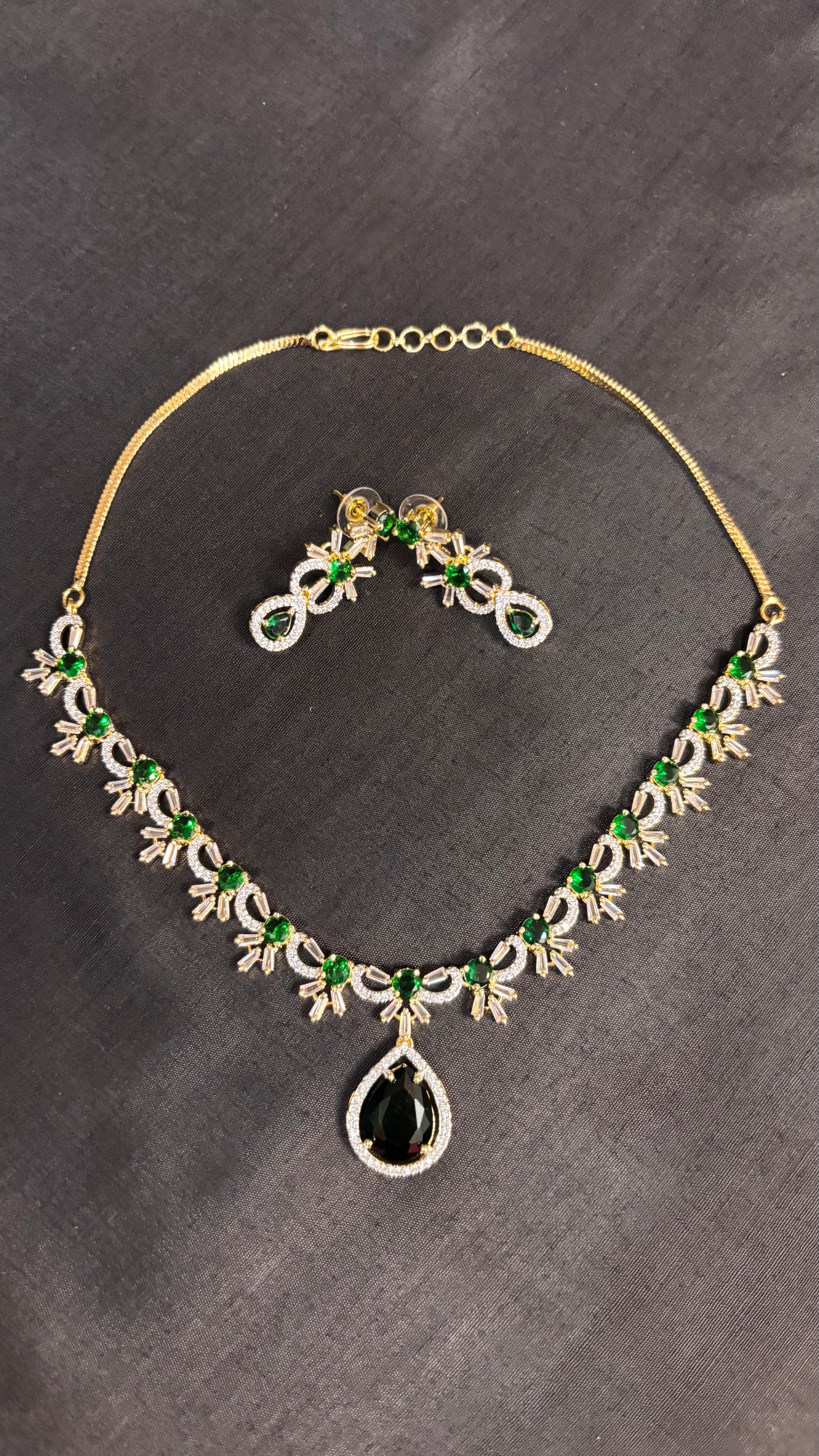 Step into elegance with this breathtakingΒ AD Green Jewellery Set, designed to add a regal charm to your look. The necklace is embellished with sparkling American Diamonds, paired with radiant green stones that bring a touch of freshness and luxury. Matching earrings complete the set, making it perfect for weddings, festive occasions, and evening parties.