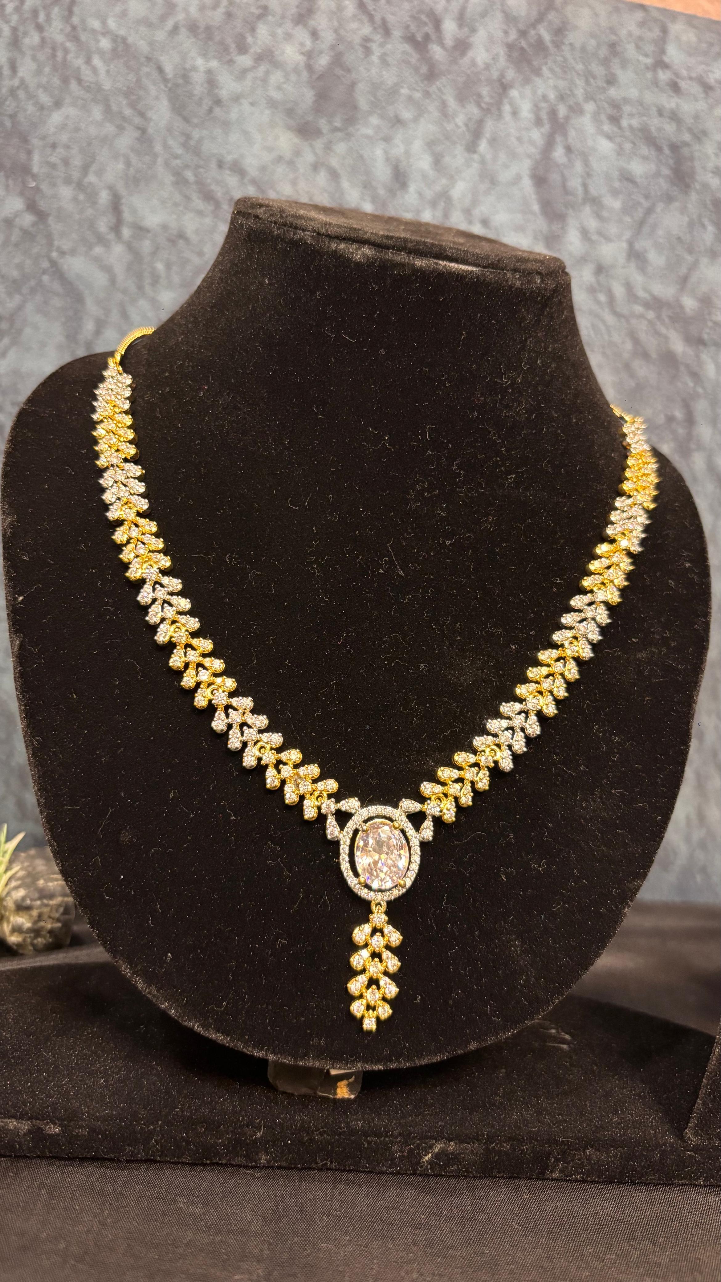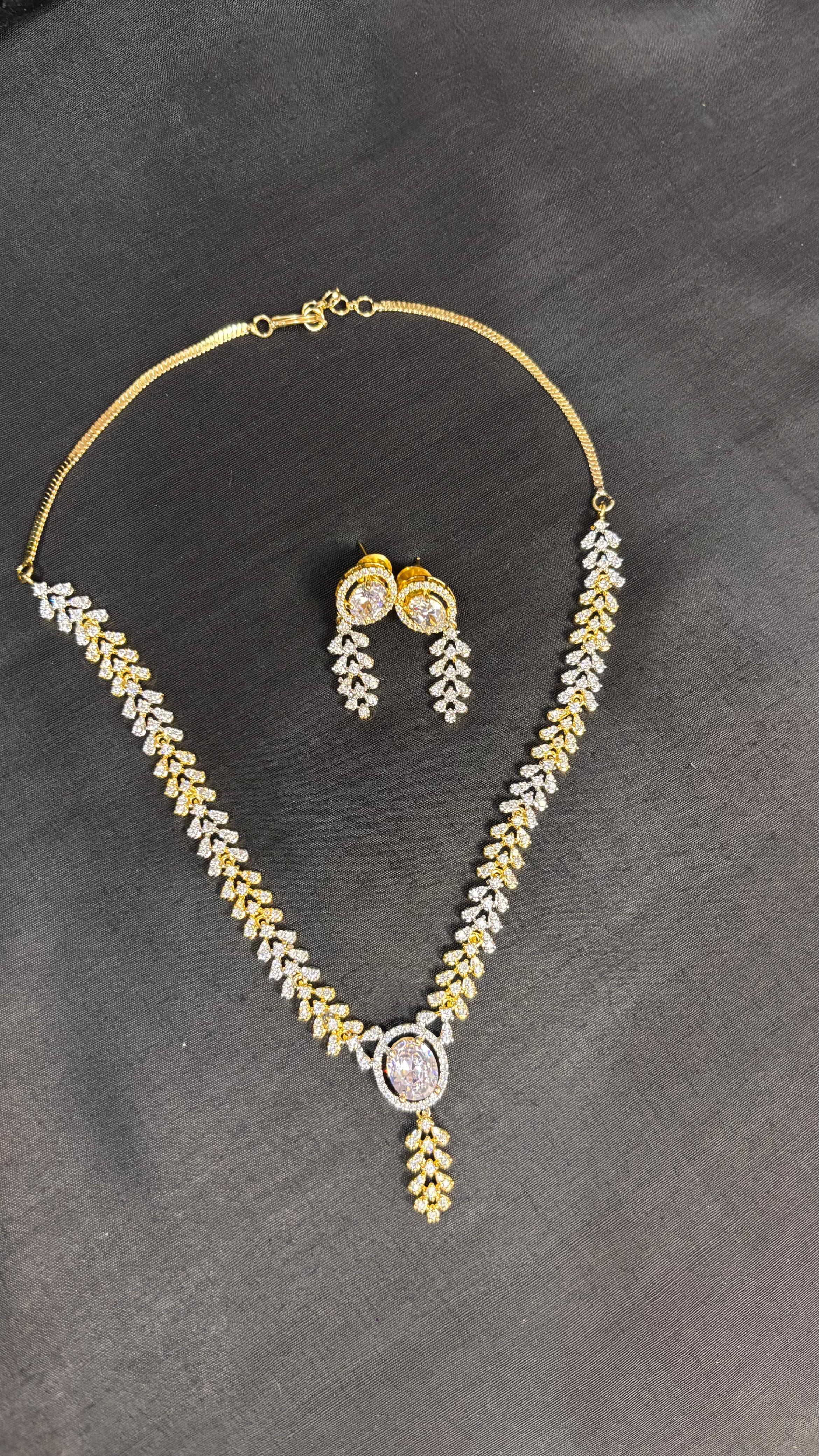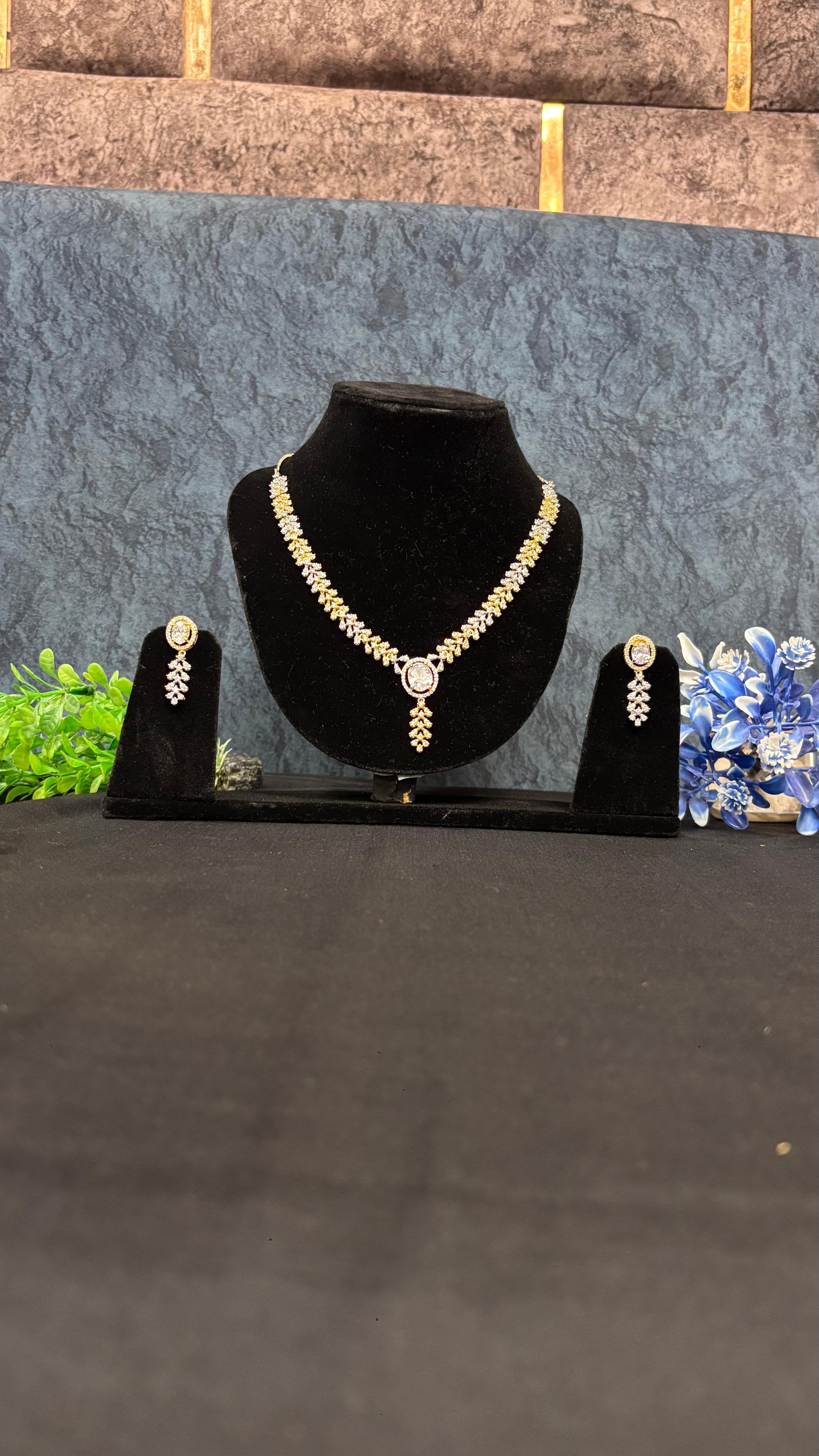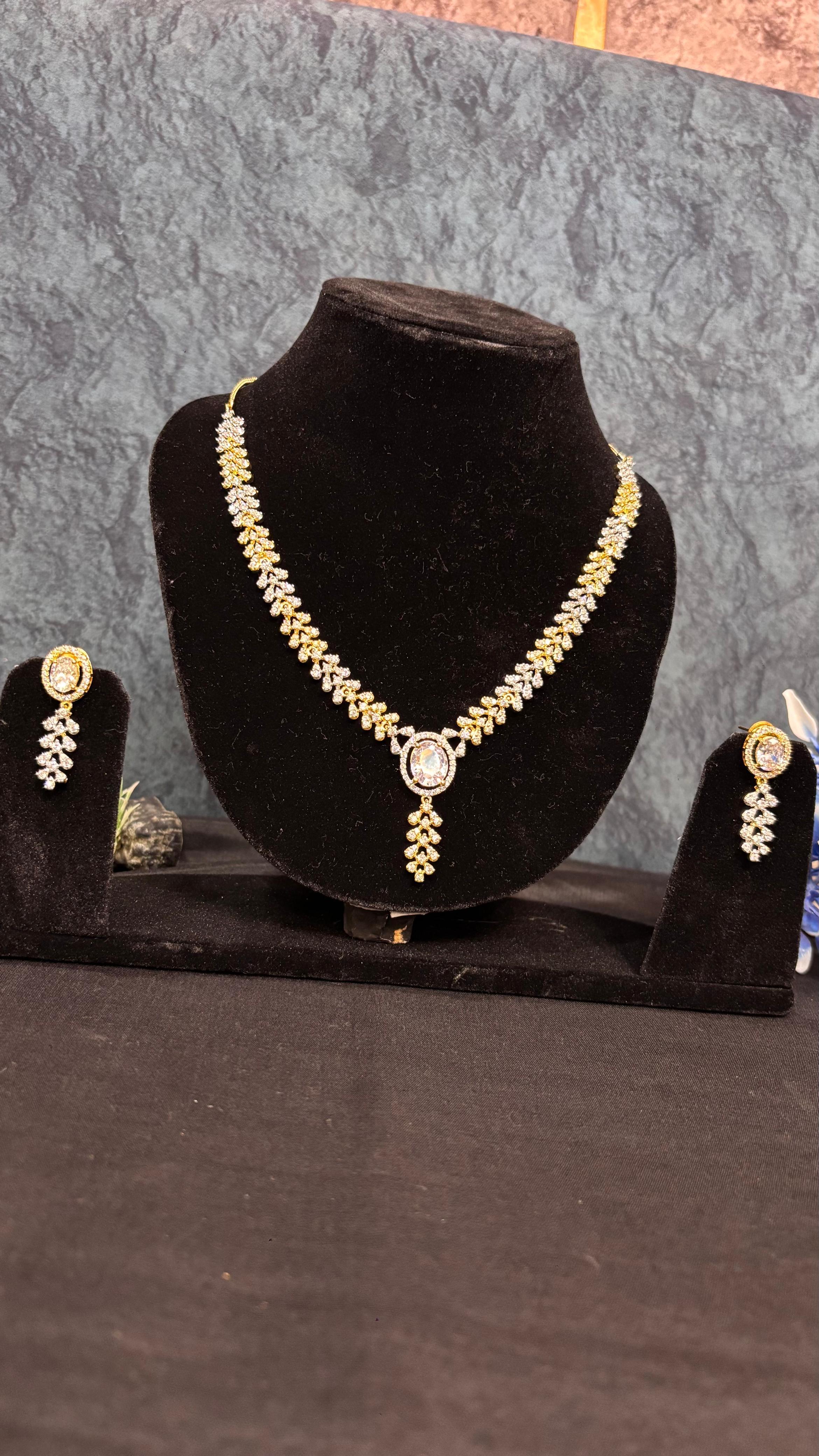Step into style with this glamorous AD Double Toned Set, crafted with brilliance and elegance. The unique dual-tone design blends shimmering silver and golden hues, creating a modern yet timeless appeal. Adorned with sparkling American Diamonds, the set includes a stunning necklace with a bold centerpiece and matching earrings, perfect for making a statement.